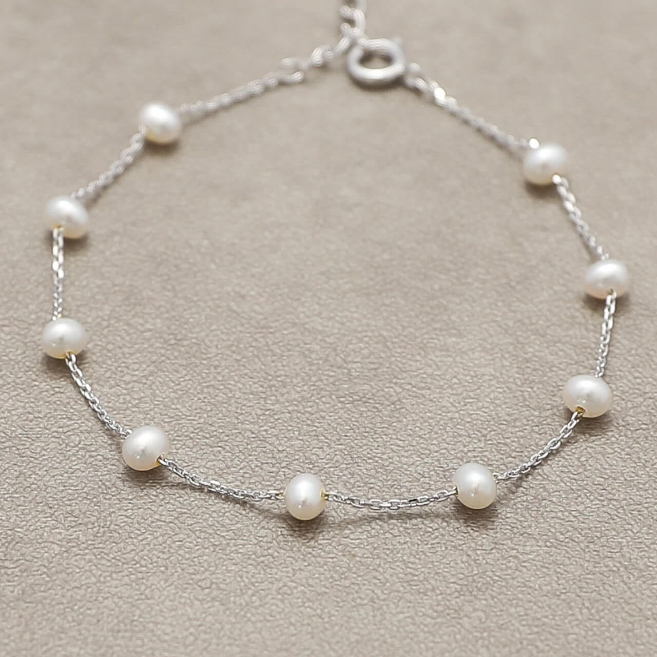 シルバーチェーンに淡水パールをバランスよく配した、シンプルで上品なデザインのブレスレットです。日常の装いにさりげなく華やかさを添えてくれる一本で、カジュアルからきれいめまで、さまざまなお洋服と相性よくお使いいただけます。