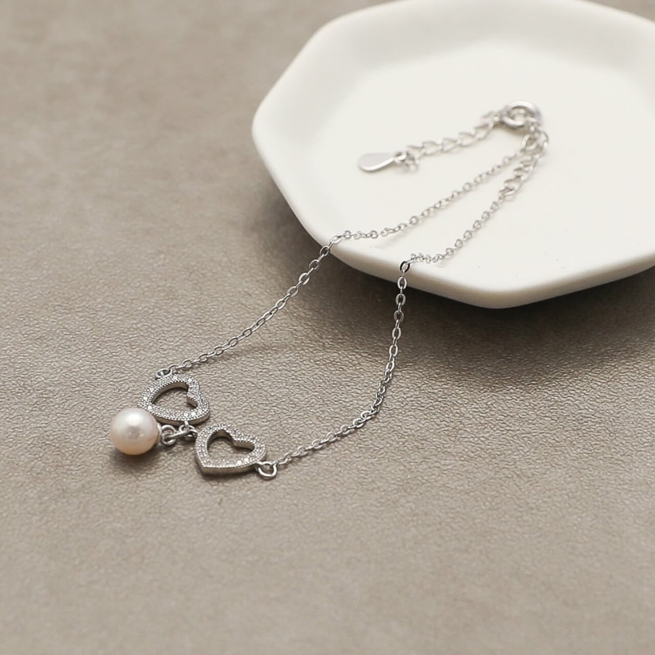 ジルコニア製のハートモチーフが煌めく、フェミニンな印象のブレスレットです。アコヤパールの上品な艶めきと、可愛らしいデザインが手元を華やかに彩ります。ガーリーなスタイルにはもちろん、ストリートテイストのクールな装いにもアクセントとして映え、幅広いコーディネートをお楽しみいただけます。