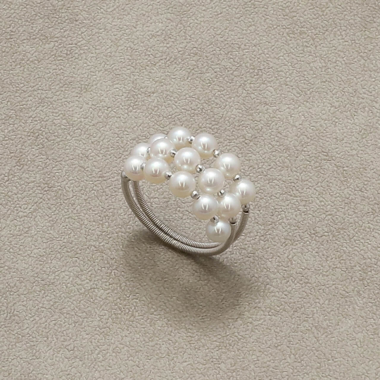 15珠のアコヤベビーパールと、その間でさりげなく輝くミラーボールが美しく調和した、華やかで可憐な印象のリングです。存在感のあるデザインながらも、カジュアルな装いとも好相性で、日常のコーディネートにも取り入れやすいアイテムです。形状記憶タイプのフリーサイズ仕様のため、指にやさしくフィットし、快適にお使いいただけます。